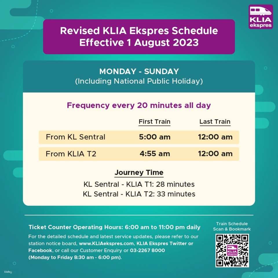 • KLIA Ekspres: For further inquiries, please contact +60-3-2267-8000 on Mondays–Fridays from 8:30 am–6:00 pm or send an email to CustomerEnquiry@KLIAekspres.com
